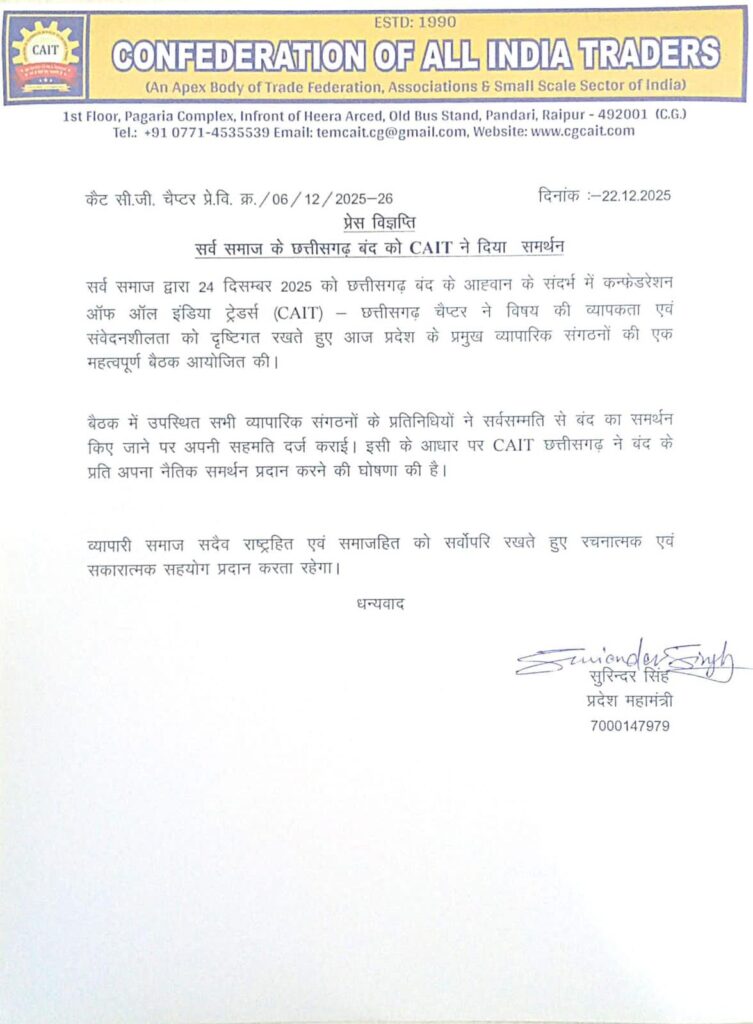 रायगढ़ । कांकेर जिले के बड़े तेवड़ा गांव में धर्मांतरित व्यक्ति के शव दफन को लेकर उत्पन्न विवाद और स्थानीय जनजाति समाज पर कथित हमले के विरोध में सर्व समाज छत्तीसगढ़ द्वारा 24 दिसंबर को आहूत प्रदेशव्यापी बंद को कन्फेडरेशन ऑफ ऑल इंडिया ट्रेडर्स (कैट) छत्तीसगढ़ चैप्टर ने पूर्ण समर्थन दिया है। इस मुद्दे की गंभीरता और संवेदनशीलता को देखते हुए कैट ने प्रदेश के प्रमुख व्यापारिक संगठनों की एक महत्वपूर्ण बैठक आयोजित की, जिसमें सभी प्रतिनिधियों ने सर्वसम्मति से बंद का समर्थन करने का निर्णय लिया।
