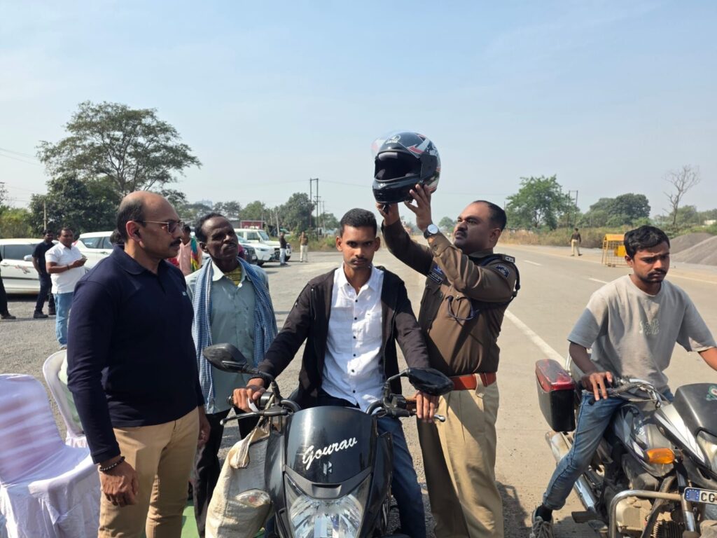 एनएच-49 पर रायगढ़ पुलिस का यातायात जागरूकता अभियान- ब्लैक स्पॉट कांशीचुआ पर बिना हेलमेट दुपहिया चालक पर चालानी कार्यवाही कर बांटे हेलमेट