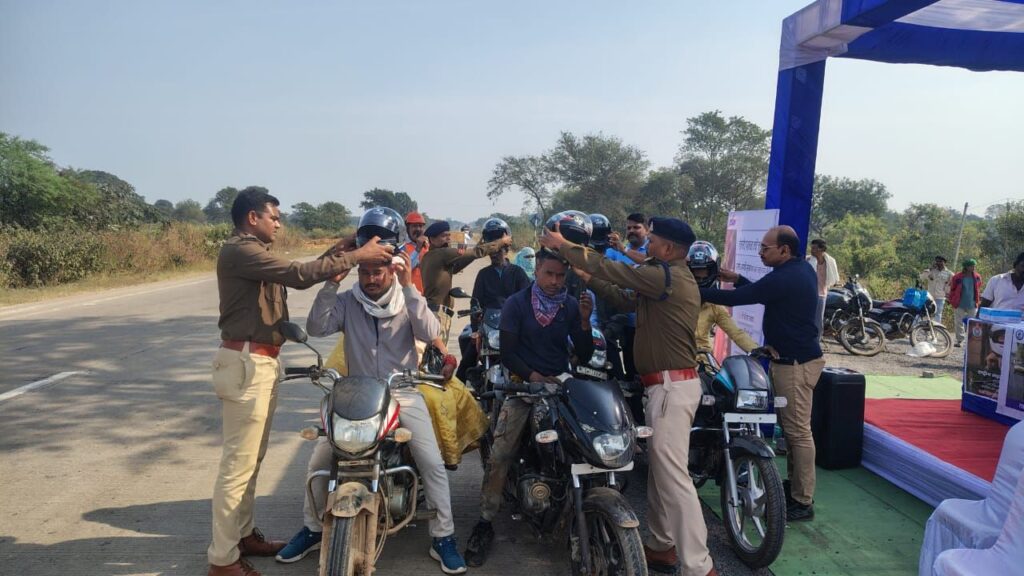 यातायात जागरूकता अभियान में चालानी कार्यवाही के साथ बिना हेलमेट दुपहिया चालकों को बांटे 200 हेलमेट